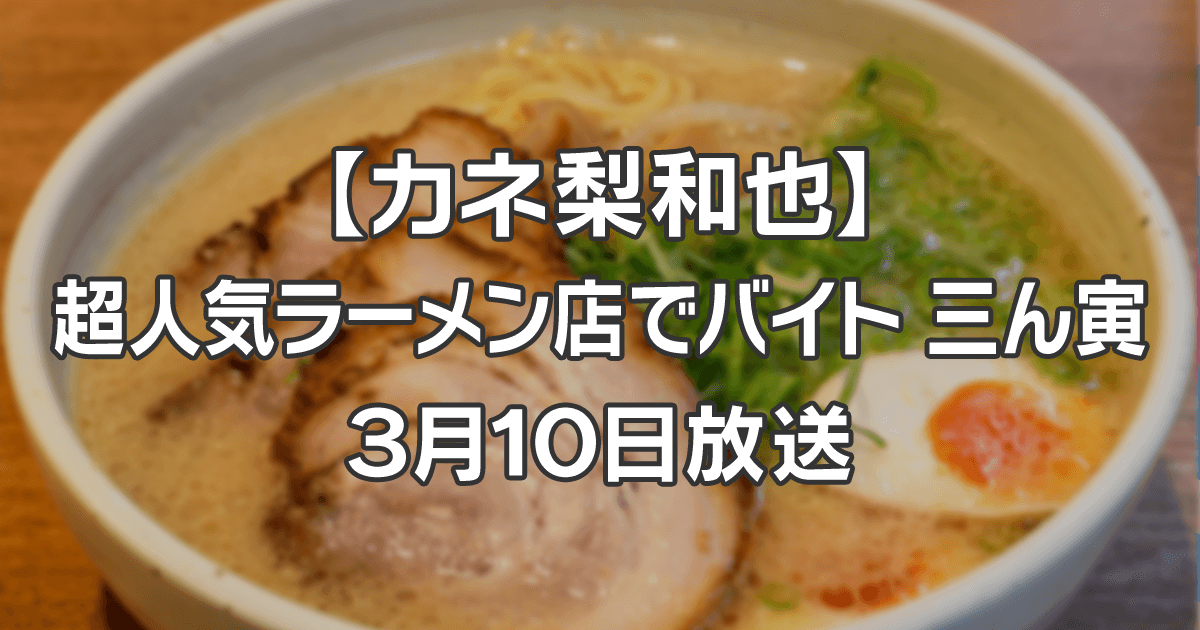 2023年3月10日放送の日本テレビ系列「カネ梨和也」では、亀梨和也さん(KAT-TUN)、伊藤俊介さん(オズワルド)、ディレクターの3人が超人気ラーメン店で働き、まかないを食べていました。