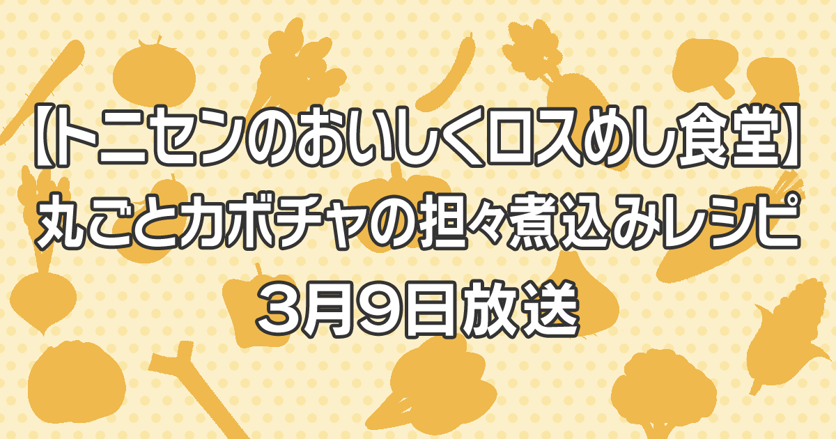 2023年3月9日放送のTBS系列「トニセンのおいしくロスめし食堂」では、カボチャをタネ&ワタまで無駄なく使っておいしいロスめしのレシピを紹介していたので、レシピをまとめます。